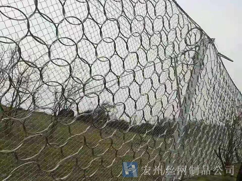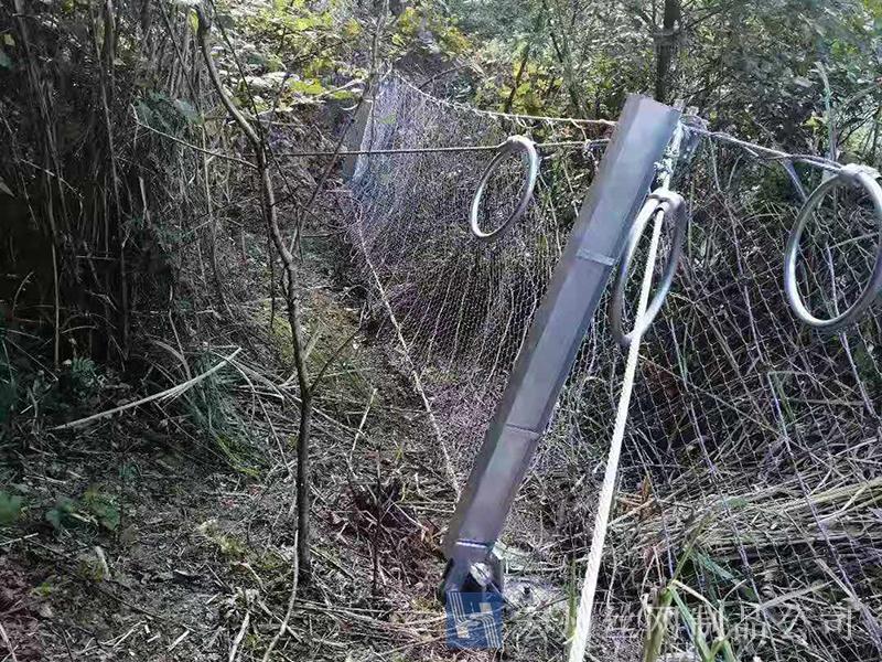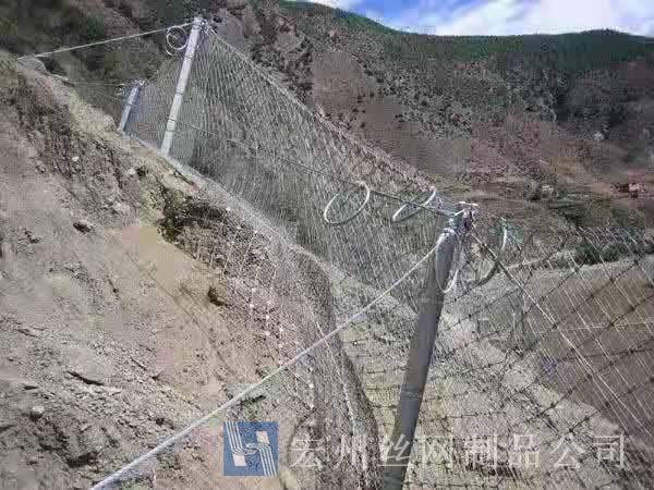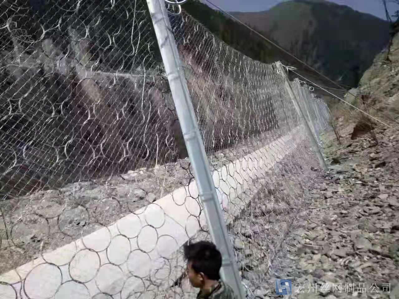 材質(zhì):鋼絲繩網(wǎng)、支撐繩和減壓環(huán)構(gòu)造:由鋼絲繩網(wǎng)或環(huán)形網(wǎng)(需攔截小塊落石時(shí)附加一層鐵絲格柵)、固定系統(tǒng)(錨桿、攔錨繩、基座和支撐繩)、減壓環(huán)和鋼柱四個(gè)主要部分構(gòu)成。